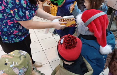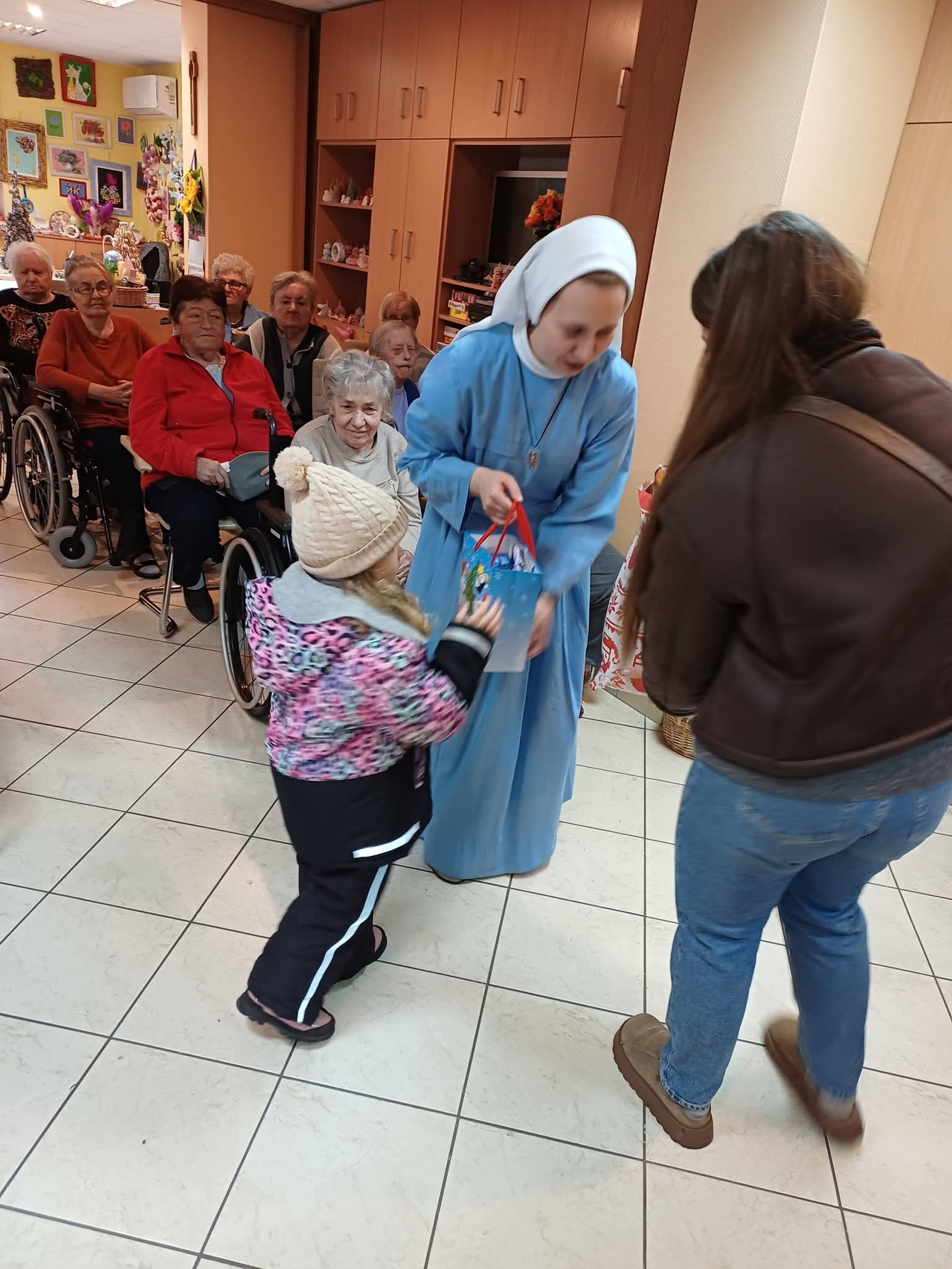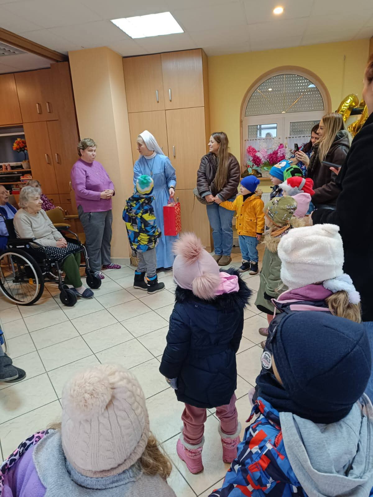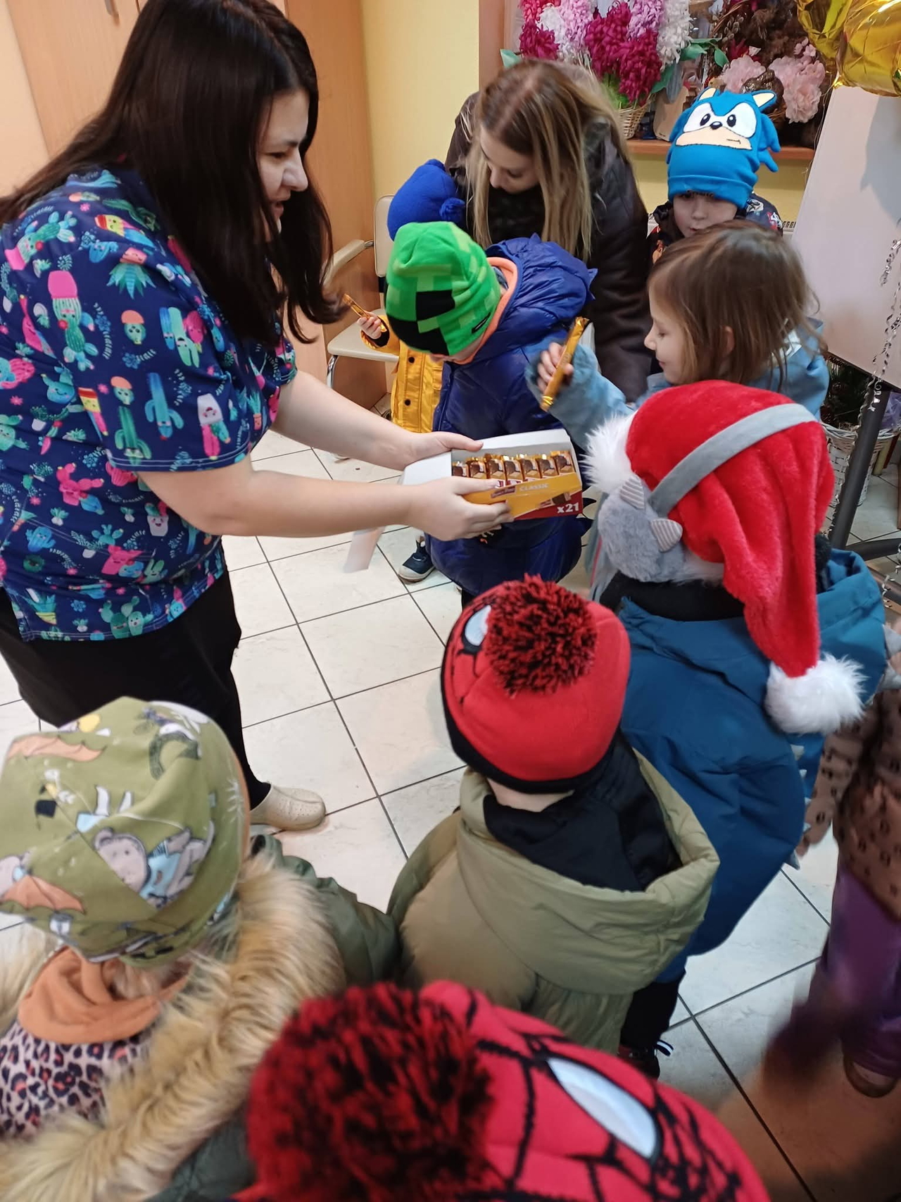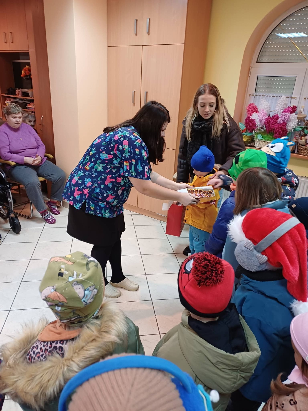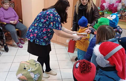 Dziś dzieci z Przedszkola Kot w butach odwiedziły naszych Mieszkańców. Na początku przekazały świąteczne paczki przygotowane w ramach akcji "Paczka dla Seniora". Każda paczka wypełniona była ręcznie robionymi upominkami, w których widać ogrom włożonego serca.