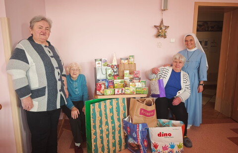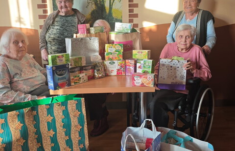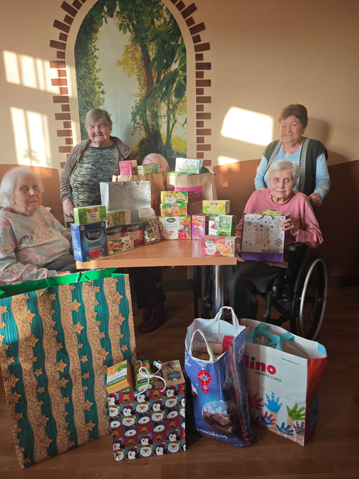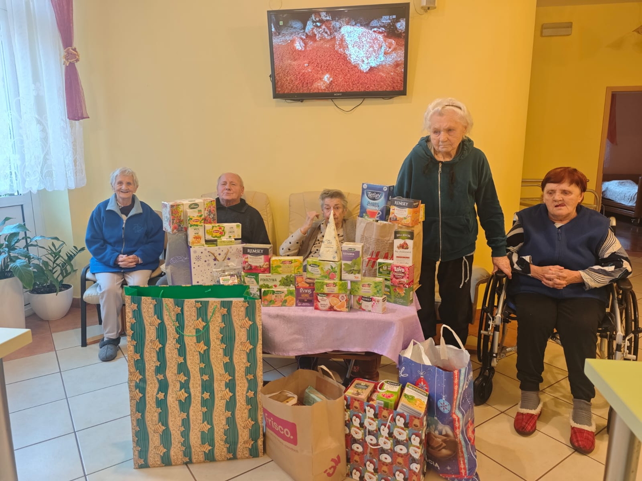 Spotkanie rozpoczęło się od przekazania paczek przygotowanych dzięki wsparciu uczniów, rodziców i nauczycieli w ramach akcji "Herbatka i czekoladka dla seniora". Wśród upominków znalazły się herbaty, ciastka, czekoladki, które wywołały wiele ciepłych reakcji i wzruszeń.