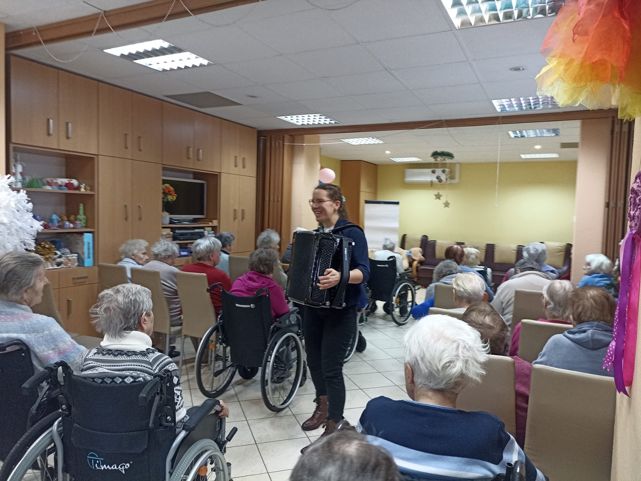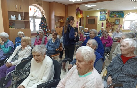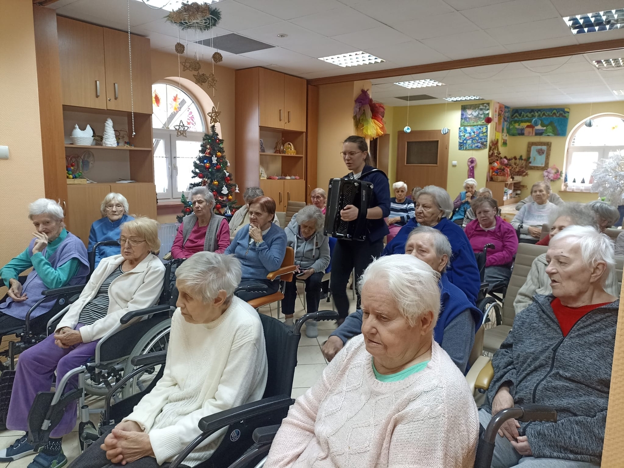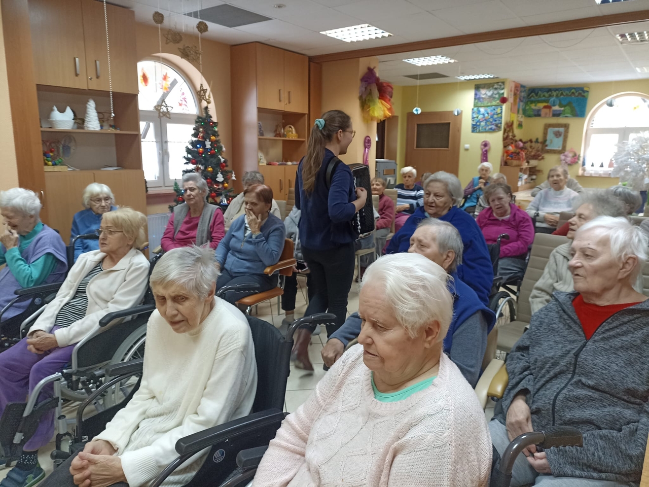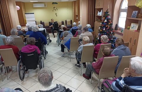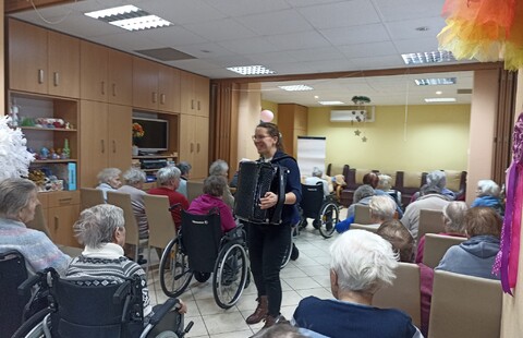 Przed dwoma dniami odwiedziła nas Pani Ewa , absolwentka Akademii Muzycznej, muzykoterapeutka, ale przede wszystkim osoba bardzo utalentowana i z ogromnym poczuciem humoru. Wspólnie z Panią Ewa przy akompaniamencie akordeonu śpiewaliśmy znane polskie kolędy.