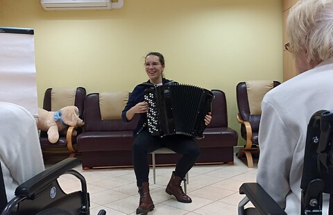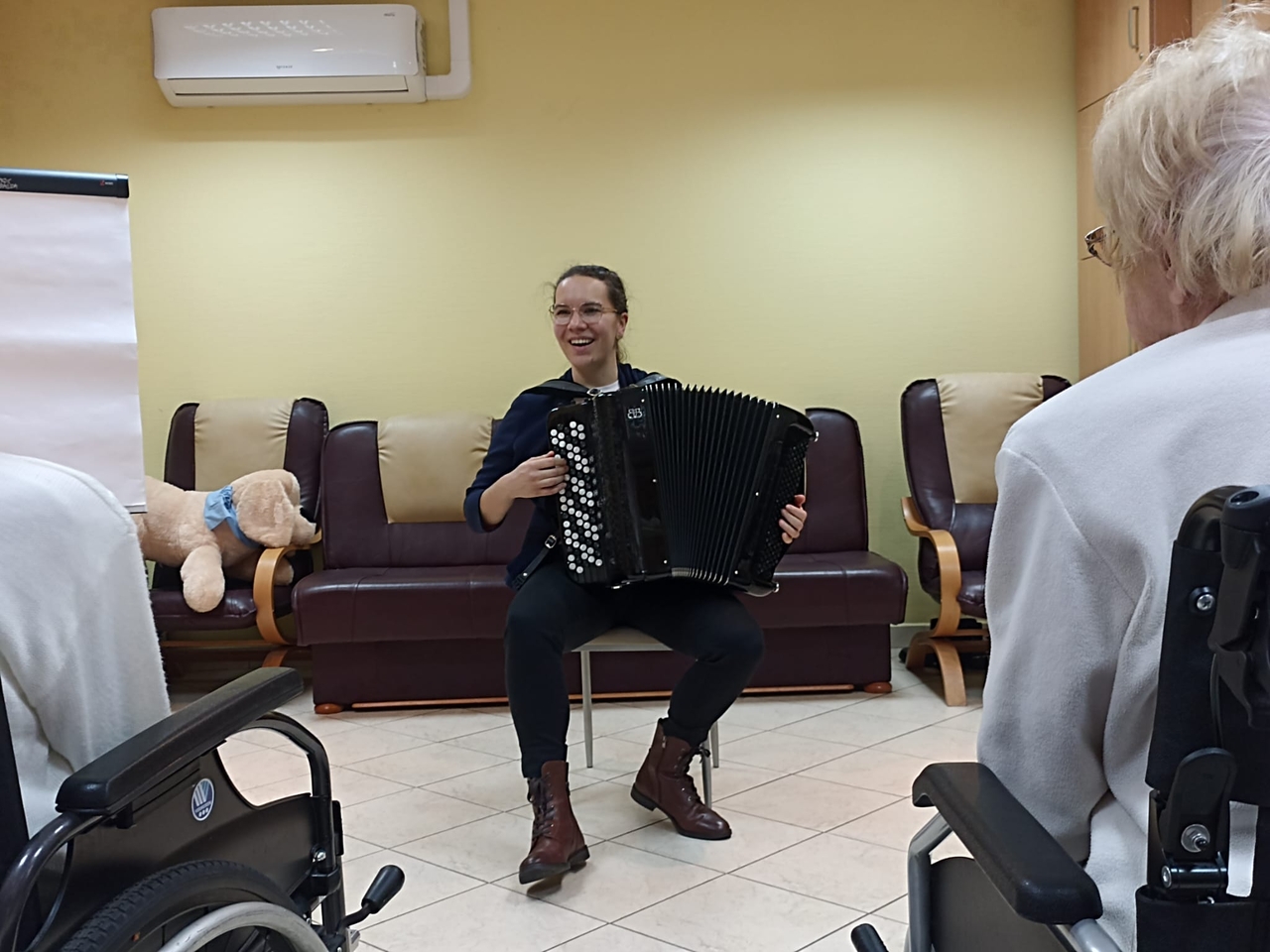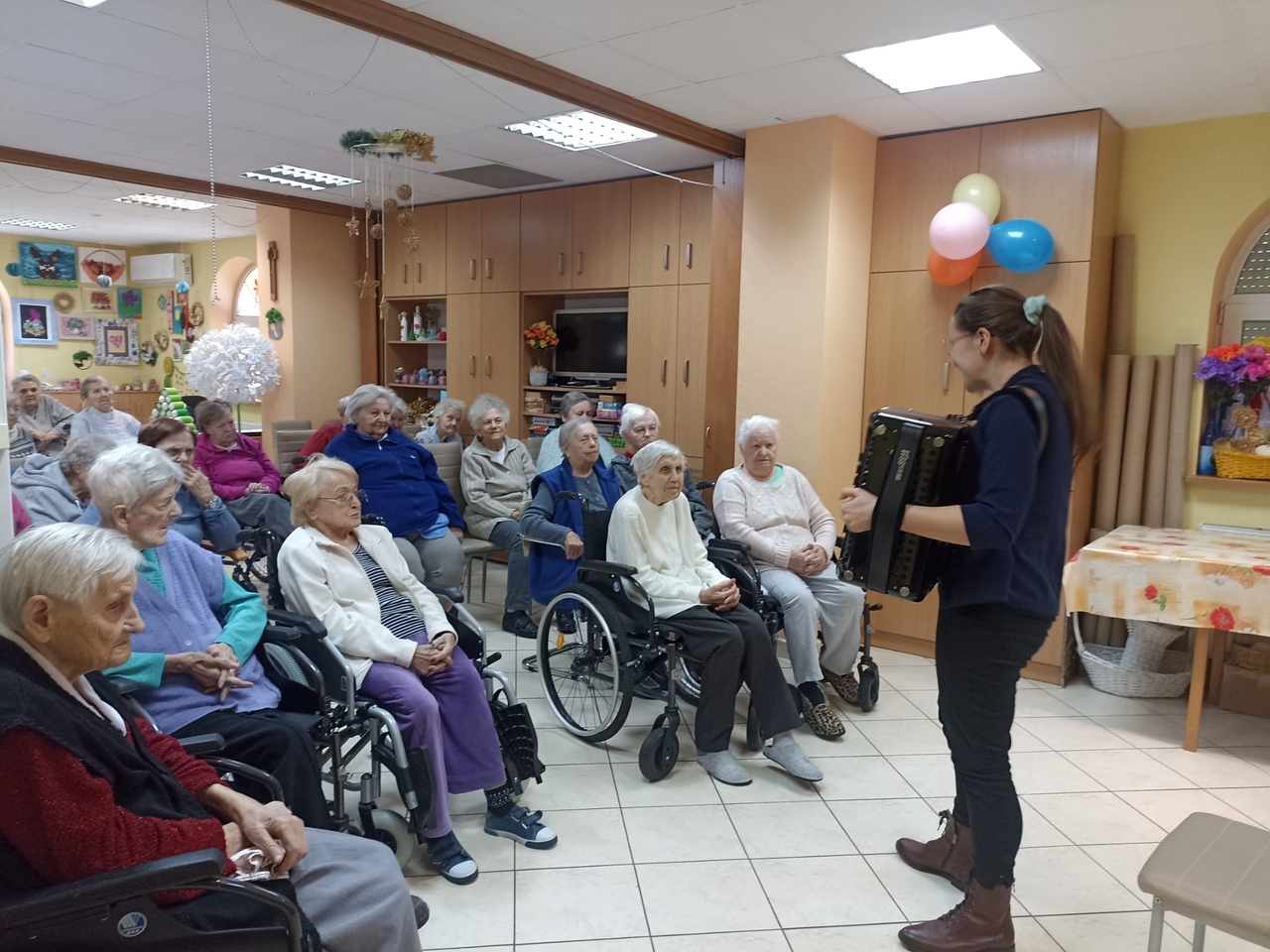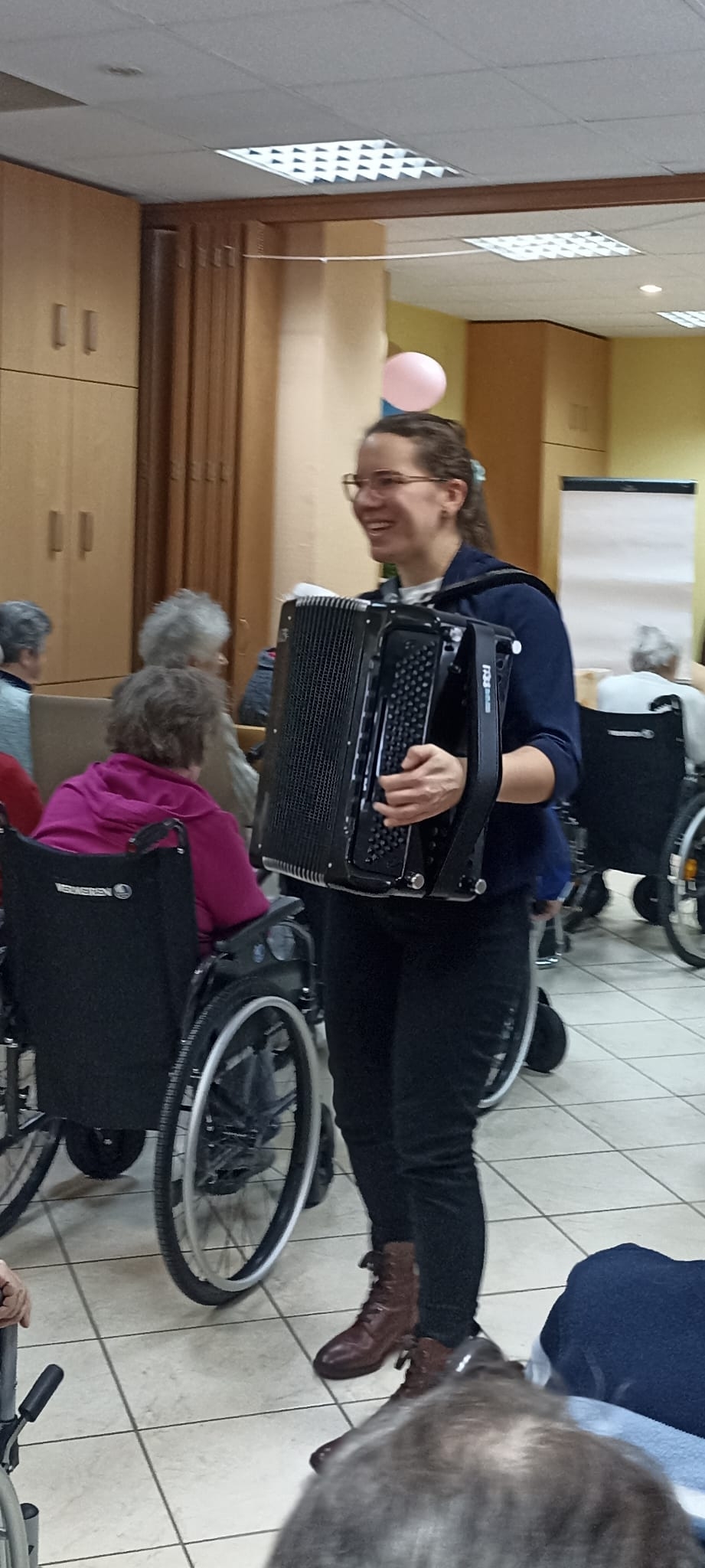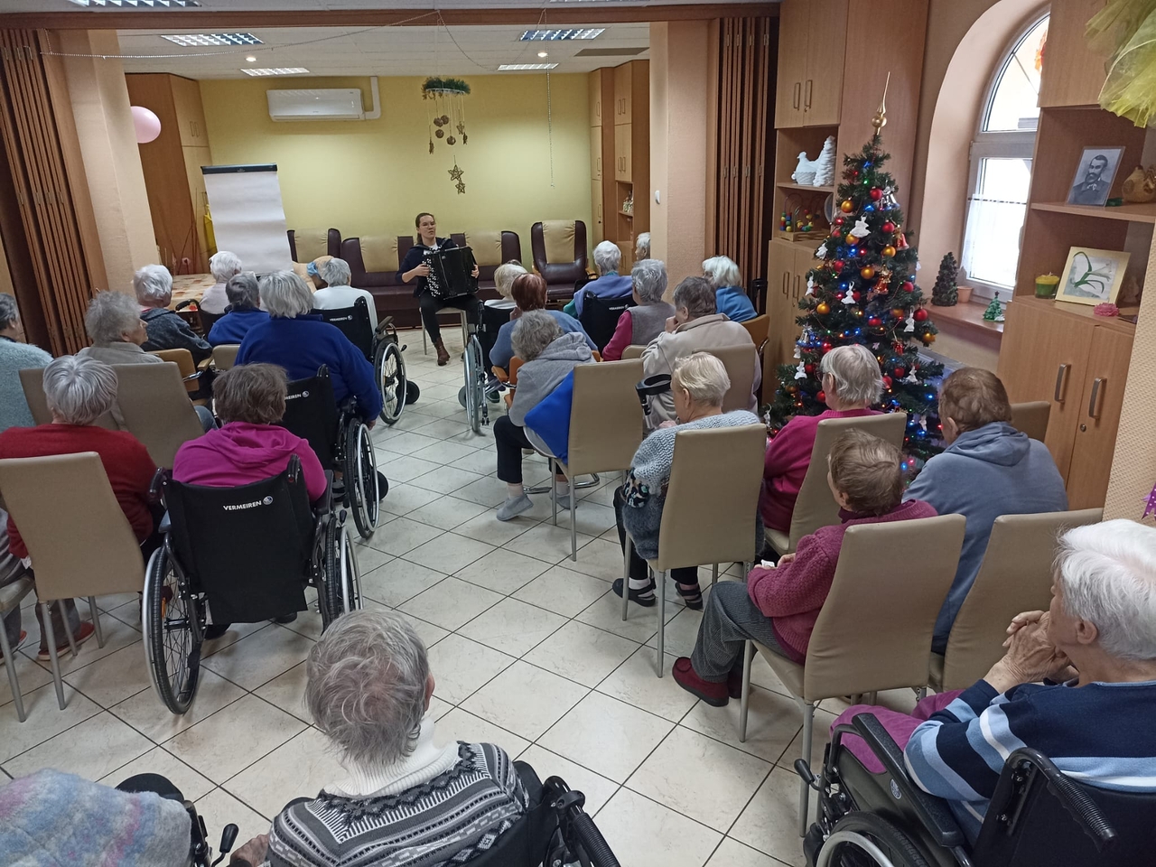 Przed dwoma dniami odwiedziła nas Pani Ewa , absolwentka Akademii Muzycznej, muzykoterapeutka, ale przede wszystkim osoba bardzo utalentowana i z ogromnym poczuciem humoru. Wspólnie z Panią Ewa przy akompaniamencie akordeonu śpiewaliśmy znane polskie kolędy.